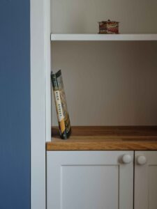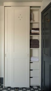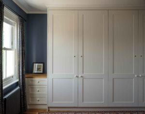 “The oak staircase was an important design feature in the renovation. Each floor had bespoke cabinetry by Law & Lewis Ltd in moisture-resistant MDF with Shaker style doors and full factory paint finish.  The cabinetry included wardrobes to Bedrooms 1, 2, 3 & 4, bathroom cabinets, alcove storage in living room and two cupboards in hallways.”