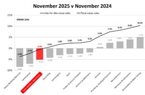 The latest Builders Merchant Building Index (BMBI) report, published in January, shows builders’ merchants’ like-for-like total value sales in November 2025 were -0.4% lower than November 2024, with Timber and Joinery Products suffering a -2.4% loss year-on-year.