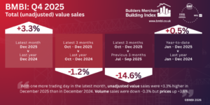 The latest Builders Merchant Building Index (BMBI) report for Q4 2025 has revealed builders’ merchants’ like-for-like value sales, adjusted to remove the impact of trading days, were -1.2% lower than Q4 2024. Like-for-like volume sales were down -2.9%.