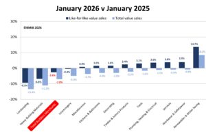 The latest Builders Merchant Building Index (BMBI) report, published in March, shows January’s builders’ merchant like-for-like value sales (adjusted to remove the effect of trading days) were -2.6% lower than January 2025. Like-for-like volume sales fell -7.2% while prices increased +5.0%.